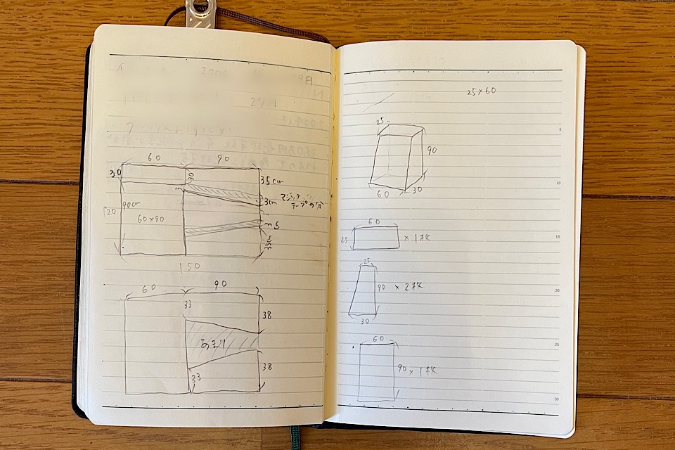これをもとに簡単な図を書いて、ビニールシートの切り方を考えます。