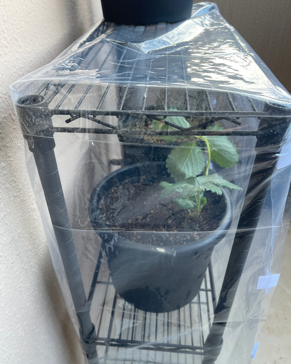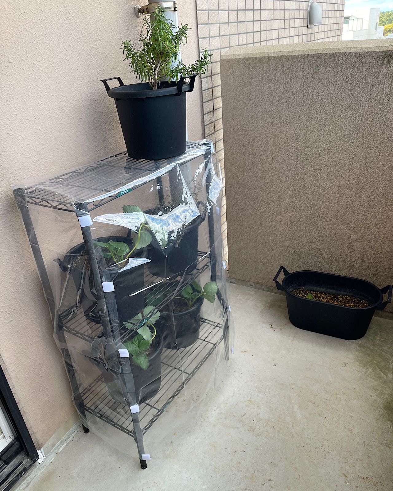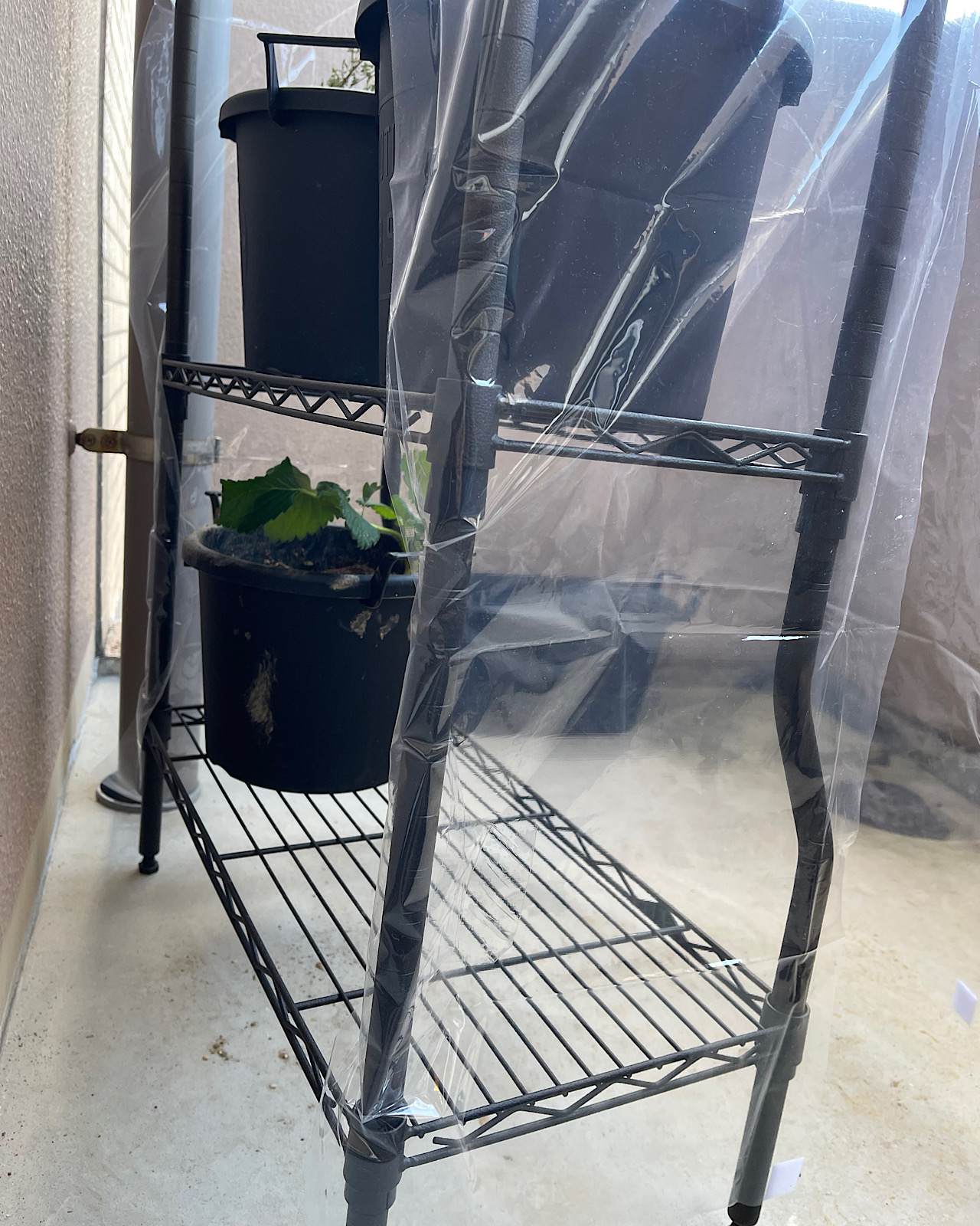 ベランダのガーデンラックを、100均アイテムを使って自作の温室にした