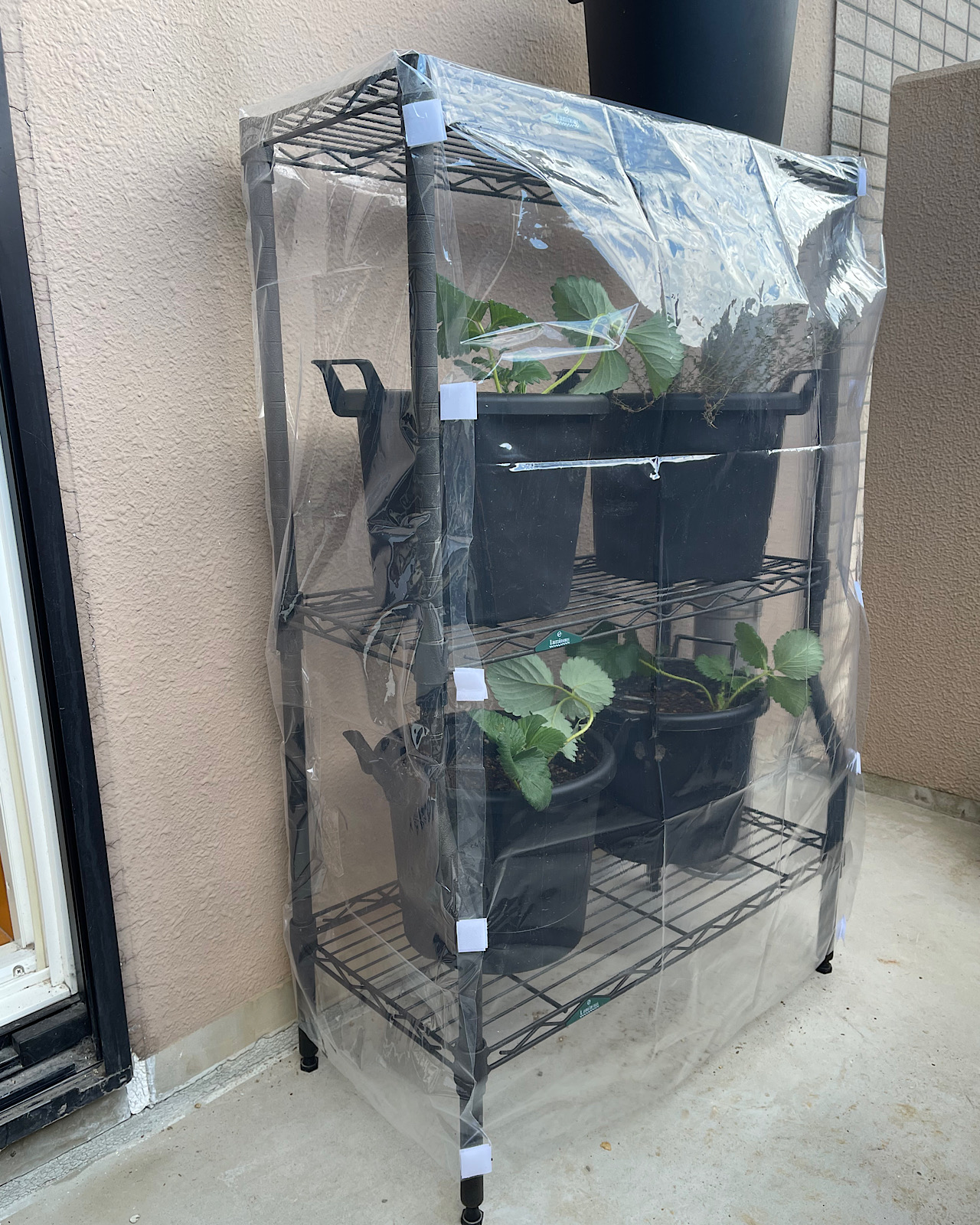 ベランダのガーデンラックを、100均アイテムを使って自作の温室にした